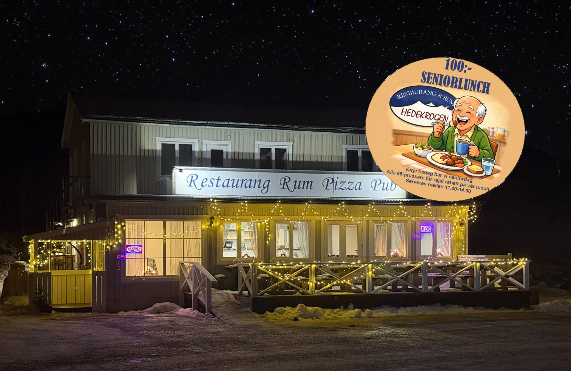 Kolla vår seniorrabatt. Dagens lunch för 100 kronor på tisdagar.